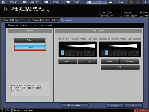 If you select Tray1 to Tray9 of Paper Feed Unit PF-707m or Paper Feed Unit PF-711 in step 5 and then press Air Assist, the following Air Assist screen is displayed.