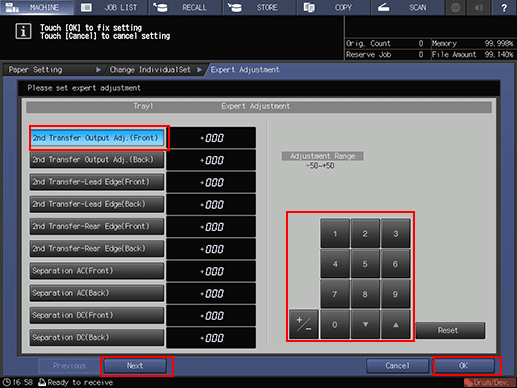 supplementary explanationFor the Pre-regist. Loop Adj.(Front) that is displayed by pressing Next twice from 2nd Transfer Output Adj. (Front), select the button for the item you want to adjust and press the touch panel keypad, down, up, or the keypad on the control panel to enter values.