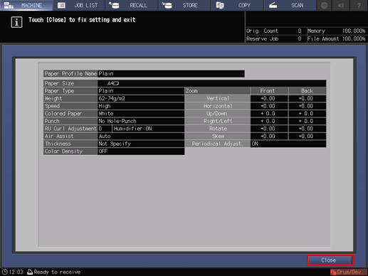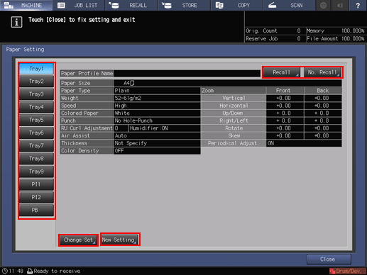 Pressing Recall displays the Recall screen, on which registered paper specifications can be selected. Proceed to step 7.