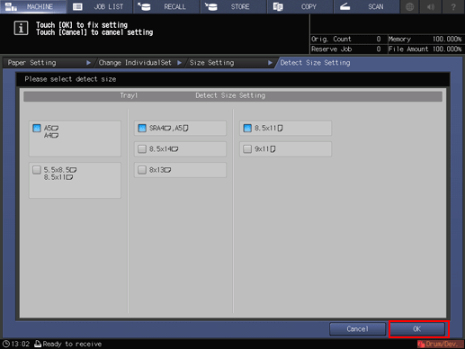 Press Detect Size Setting. The Detect Size Setting screen is displayed.