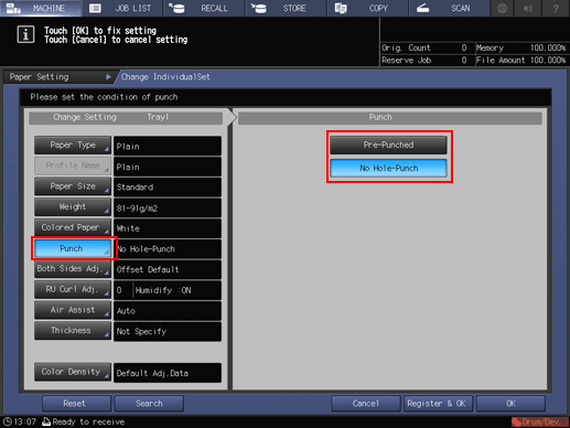 Select Pre-Punched when loading sheets with punched holes, and select No Hole-Punch when loading sheets without punched holes.