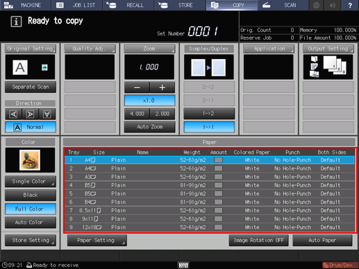 supplementary explanationThe screen provides Size, Name, Weight, Amount, Colored Paper, Punch, and Both Sides in a line for each tray. The Name normally shows a paper type, or a profile name if registered specifications are recalled.