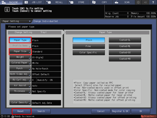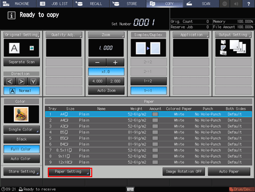 Each paper tray has been preset with paper specifications. If you want to use another paper type than any loaded in the trays, follow the procedure below to change the Paper Setting.