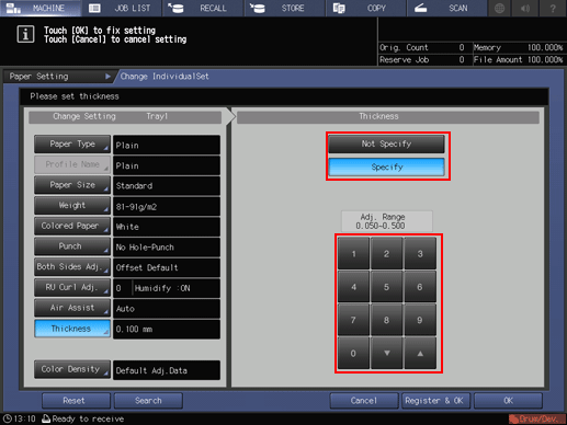 Selecting Specify displays the touch panel keypad. Use the touch panel keypad or downup to enter the adjustment value. Available range is from 0.050 mm to 0.500 mm.