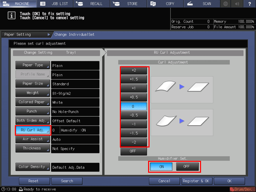 supplementary explanationIf the paper weight of Color Specific is set to 52 g/m2 to 135 g/m2 / 14 lb Bond to 36 lb Bond, and the paper weight of Coated-GL, Coated-ML, Coated-GO, and Coated-MO is set to 81 g/m2 to 135 g/m2 / 22 lb Bond to 36 lb Bond, the Humidifier Set. and ON/OFF selection become unavailable.