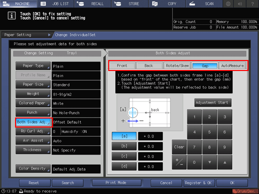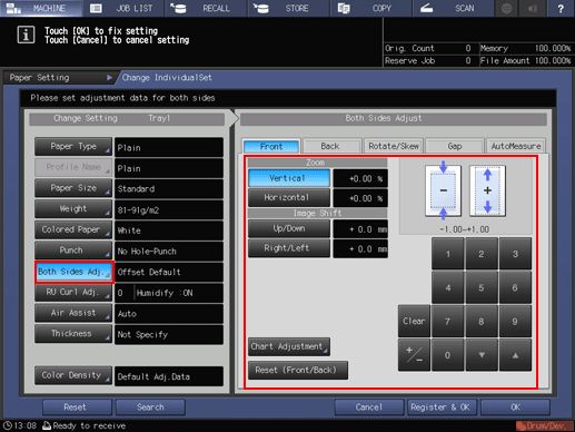 If you change settings of Zoom, Image Shift, Rotate/Skew, and Chart Adjustment for Front or Back, or perform the Gap adjustment, the indication of Both Sides Adjust on the Change Individual Set screen is changed to Offset Changed.