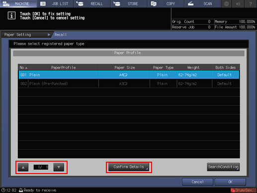 supplementary explanationIf you know the profile number of the paper condition to be recalled, press No. Recall. You can enter the profile number to easily recall the profile and configure settings.