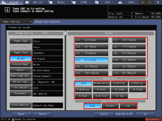 Select the desired unit key under Change Unit. The screen displays the paper weight in the selected unit.