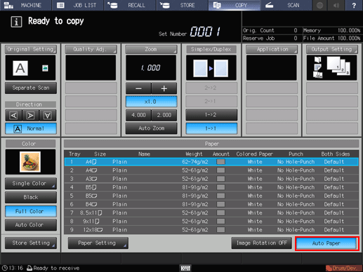 • supplementary explanationAuto Paper may not function for the tray due to the paper specifications registered for that tray, even with the selected size loaded. For details, refer to [Type for Auto Paper].