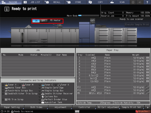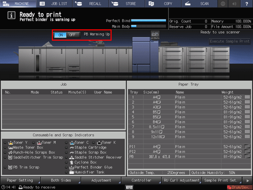 Press ON for the inner heater switch for the perfect binder provided on the MACHINE screen to start the heater of the perfect binder warming up. The message right to the inner heater switch for the perfect binder is changed to PB Shut Off to PB Warming Up.
