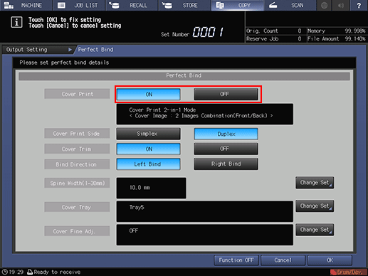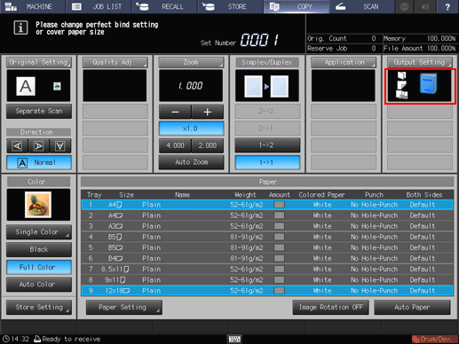 The Perfect Binding icon is displayed under Output Setting on the COPY screen.