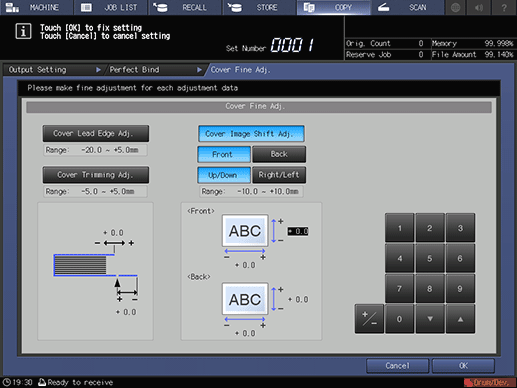 supplementary explanationTo adjust the lead edge of the cover, press Cover Lead Edge Adj.. Use the touch panel keypad, down, up, or the keypad on the control panel to enter the desired value, then press +/- to select positive or negative of the adjustment value.