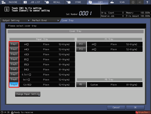 supplementary explanationFor details about the procedure of cover paper setting on the Paper Setting screen, refer to Setting Paper in a Paper Tray.