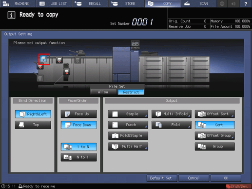 A machine mounted with Finisher FS-532 is initially set to output sorted sets to the primary (main) tray, regardless of whether or not to be mounted with other options. To deliver paper to the secondary (sub) tray, follow the procedure below to change the output tray and select the desired output mode.