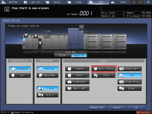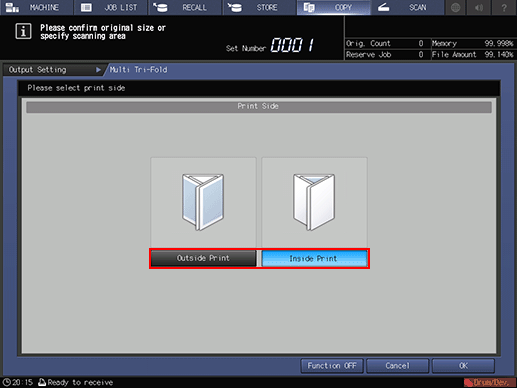 Finisher FS-532 mounted with Saddle Stitcher SD-510 allows the machine to copy on 8.5 11 short edge feed or A4 short edge feed paper and tri-fold prints can be made. When selecting Tri-Fold, also select either inside or outside to have the printed image.