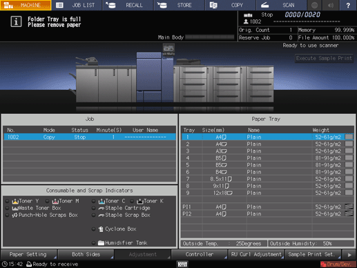 At this time, the message Folder Tray is full / Please remove paper is displayed in the message area of the screen, and the Start LED turns orange. The machine cannot restart printing even if you press Start on the control panel.