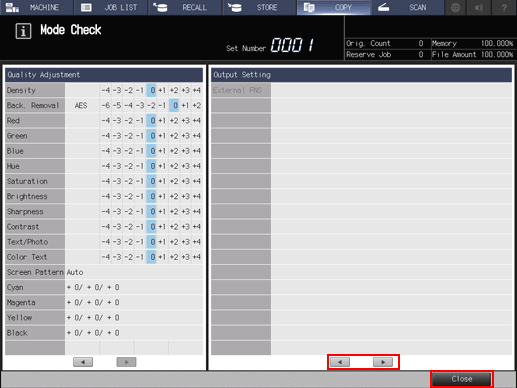 supplementary explanationThe current settings of Paper Setting, Original Setting, Zoom Setting, Color/Print Side, and Quality Adjustment are displayed in the left side area of the Mode Check screen. To switch the display, press right at the bottom of the screen.