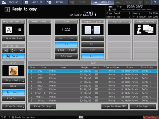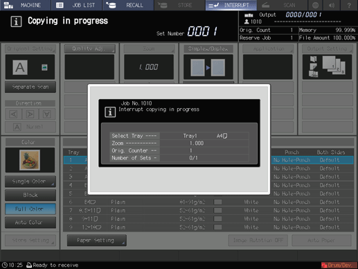 Pressing Interrupt on the control panel stops the machine operation temporarily at the timing available for interrupt copying and allows you to copy with different settings.