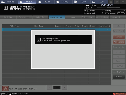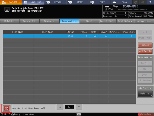 4. Press Save Job List then Power OFF  at the bottom-left corner of the screen.