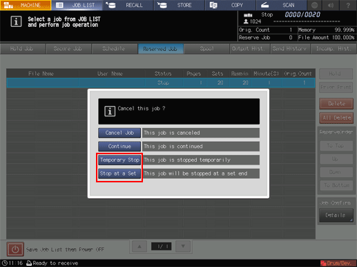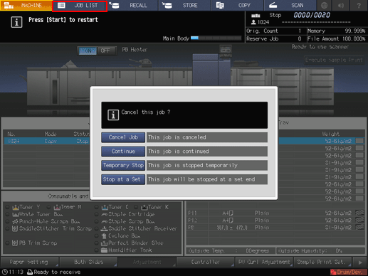 • supplementary explanationPress No to cancel continuing the job on the following day. The screen returns to the JOB LIST screen.