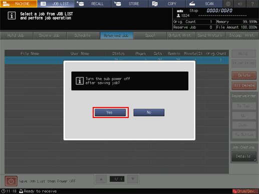 7. To continue the jobs, turn on the sub power switch to display the MACHINE screen, and then press Start on the control panel.