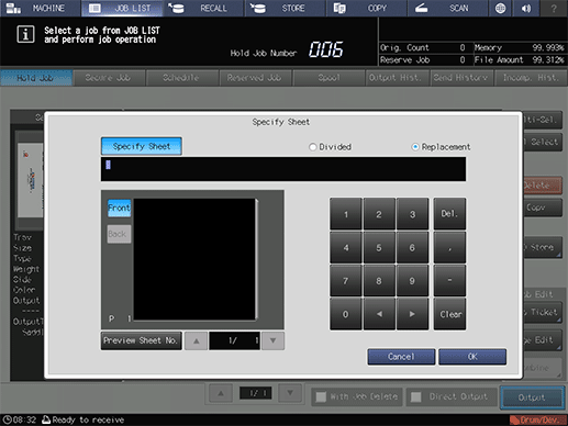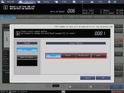 • supplementary explanationFor the target, select the output sheet from All Sheets or Specify Sheet. If a hold job moved from the reserved job list is selected, or if multiple jobs are selected, Specify Sheet is not available.