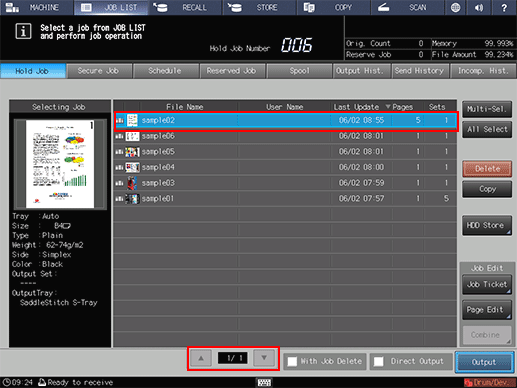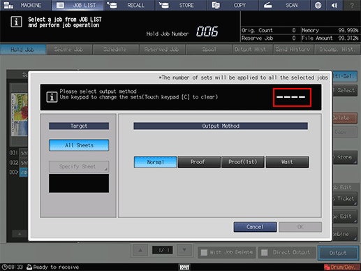 • supplementary explanationAlthough the number of sets specified for the job is displayed, you can change it for output purposes. Even if the change is made here, the original number of sets specified for the hold job remains unchanged.
