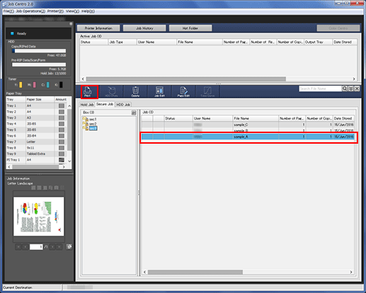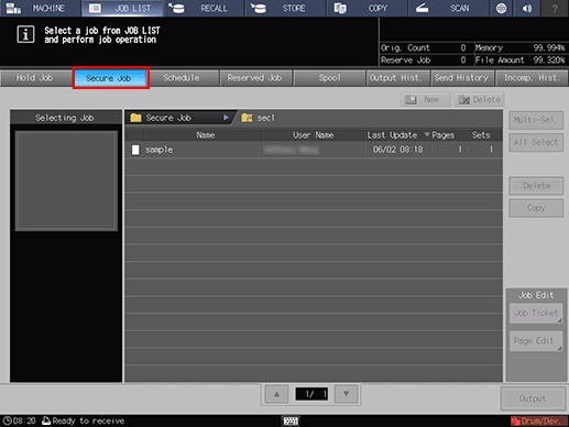 2. Click the Secure Job tab, then select the User Box that contains the target secure job.