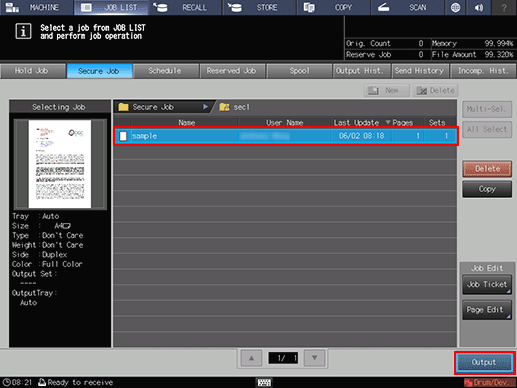 The specified job is output. When the job is output, it is deleted from a secure job.