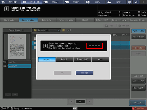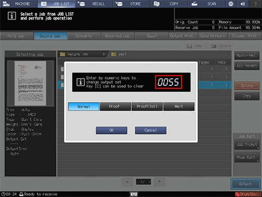 • supplementary explanationIf multiple jobs are selected, the number of sets is displayed as - - - -. Enter the number of sets to output jobs. Changed print quantity is applied to all the selected jobs. Enter the value using the keypad on the control panel.