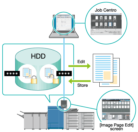 It is possible to copy/move/rotate/delete and make other editions of pages of secure jobs while viewing page thumbnails on the touch panel of the main body or a computer. The function is called "Page Edit."