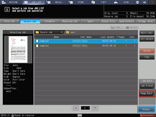 You can edit the pages of secure jobs on the touch panel of the main body.