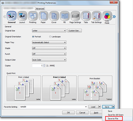 supplementary explanationIf Save to File is selected, settings are written to a file. Loading the written file (print setting file) allows you to recall the desired setting.