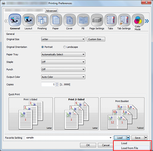 supplementary explanationIf you select Load from File in the Load pull-down menu, you can open data (print setting file) written to the file and recall the desired setting.
