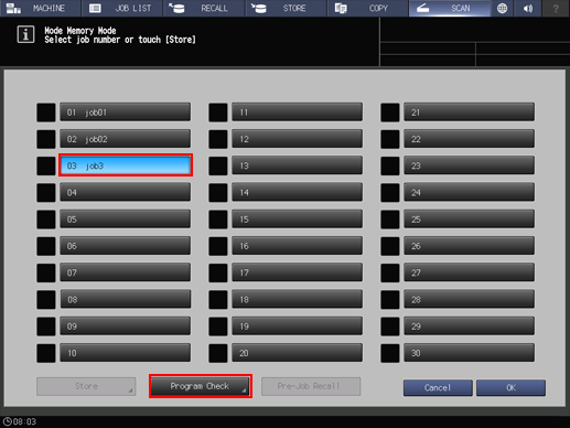 • preconditionTo display the Mode Memory Mode screen, display the SCAN screen, and then press Mode Memory on the control panel. When the MACHINE or other screen is displayed, the Mode Memory Mode screen is not displayed.
