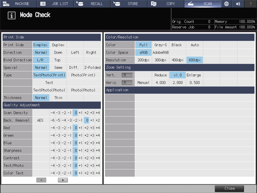 • supplementary explanationThe current settings of Color/Resolution, Zoom Setting, and Application are displayed on the right side of the Mode Check screen.