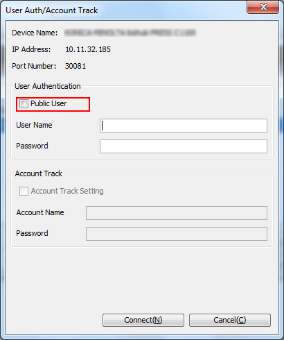 If either of the user authentication or account track function or both of them are set in the machine, you must use the User Authentication or Account Track at the time of connection.