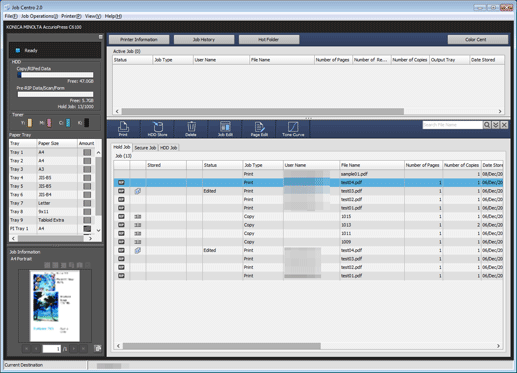 Displays in graph form and in numerical values the used amount and the free space for copy and RIPed data used for the job, and also those for Pre-RIP data, scan, and form. The number of the hold jobs is also displayed.