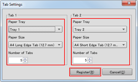 For Tab 1 and Tab 2 each, make setting of Paper Tray, Paper Size, and Number of Tabs, and then click Register.