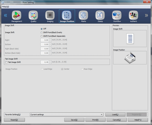 The setting items here are the same as those of "Image Position" screen of the PS Plug-in driver except the settings of the Tab Image Shift. For details about the description of the common setting items, refer to [Image Position] Screen.
