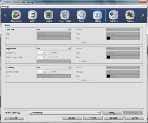 The setting items here are the same as those of the "Stamp" screen of the PS Plug-in driver. For details about the description of the setting items, refer to [Stamp] Screen.