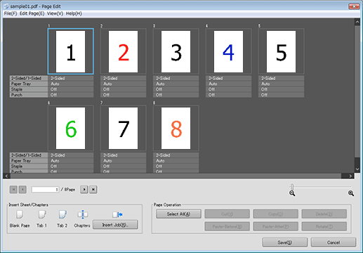Inserts the blank page, tab page or separator by dragging each icon (Blank Page, Tab 1, Tab 2, Chapters) to the page view area.