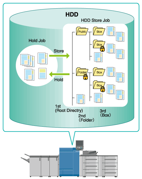 Further, you can manage a job saved on the HDD using a folder or user box.