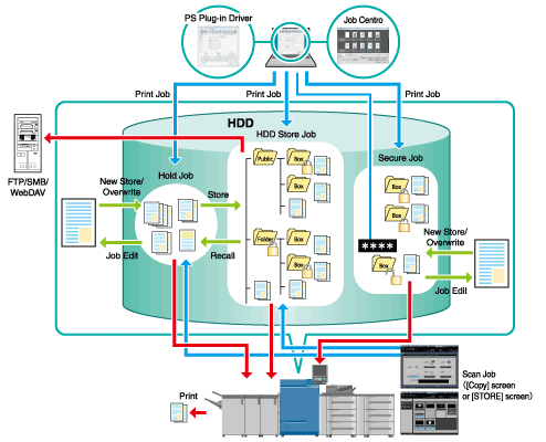 You can print a job saved on the HDD and send it to a computer on the network. Also, you can recall it as a hold job.
