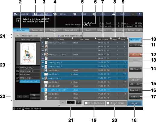 23 | Selected job | Displays a preview image and the output conditions of the job selected in the hold job list. If multiple hold jobs are selected, a list of these jobs is displayed. |