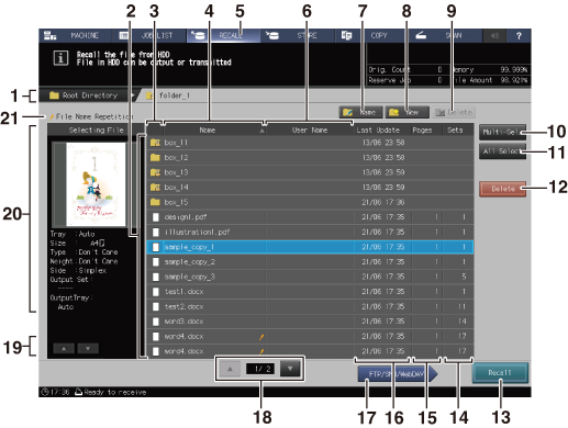 Press before selecting multiple HDD saved jobs in the list. Press first, then select jobs by pressing jobs in the job list. Press Multi-Sel. again to cancel this function. You cannot select the folders or user boxes displayed.