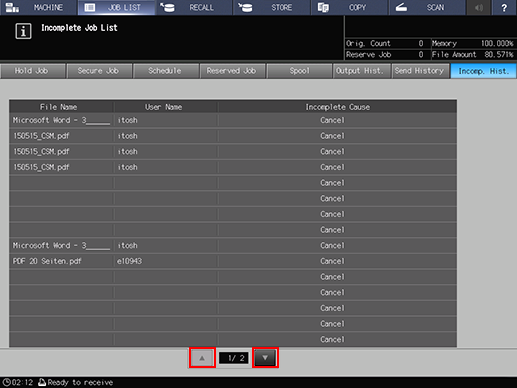 5 | Scroll keys | Used to scroll the list of incomplete history. The current page number and total page count of the list are displayed between the keys. |
