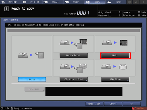 preconditionThe number of hold jobs is displayed in the message area of the Hold Job screen. The display turns red when the Hold Job number exceeds 450.