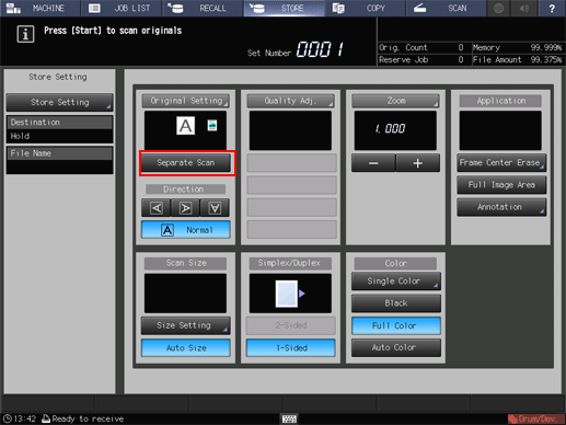 You can set separate scan, bind direction of two-sided original (whether the top and bottom of both sides are the same, or one side is flipped vertically), original orientation, and original type.