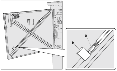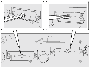 supplementary explanationWhen returning the Cleaning tool to its original position, store it with the pad at the edge of the Cleaning tool facing forward as shown below. If the Cleaning tool is inserted with the pad facing toward the door side, it may cause damage.